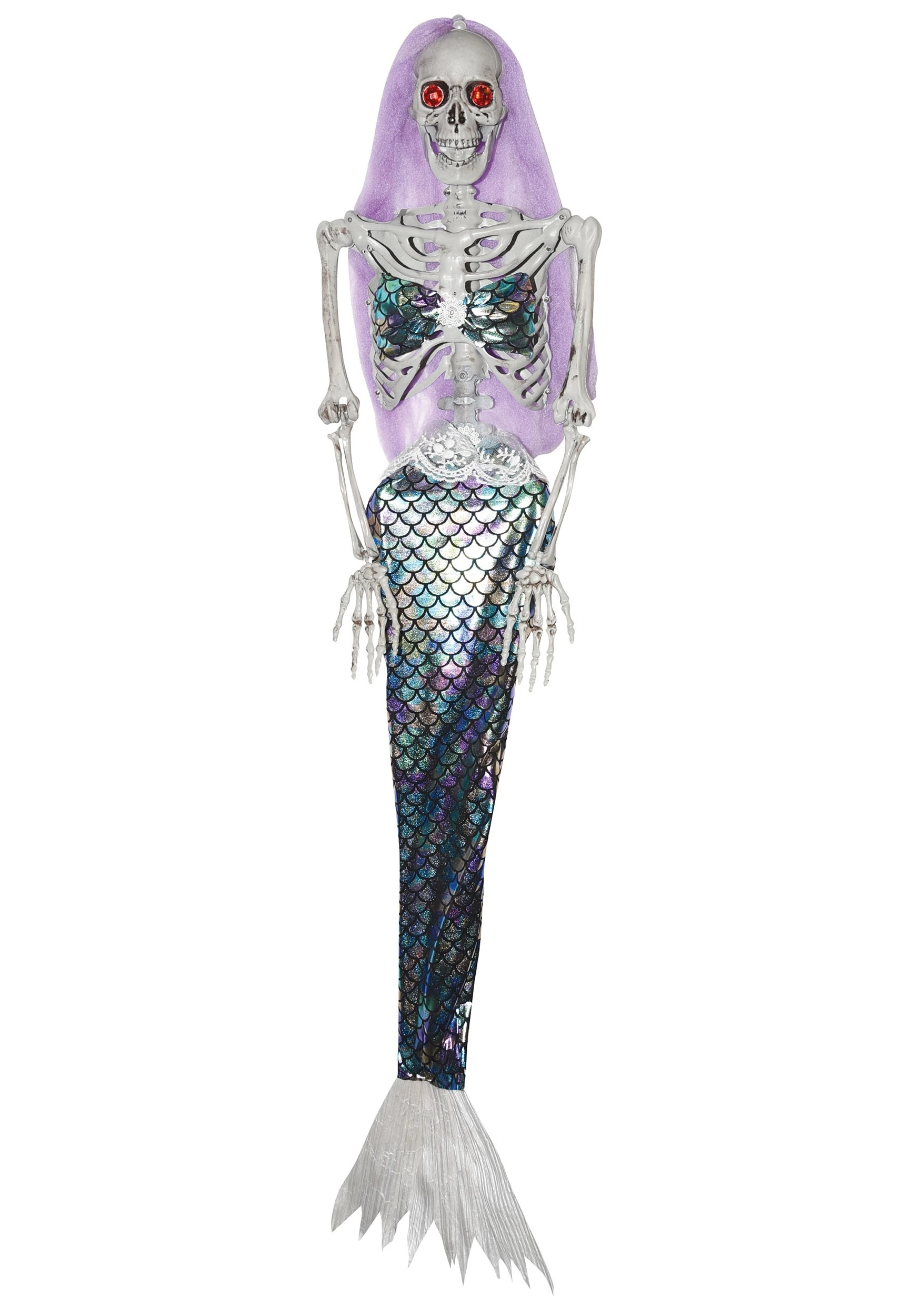 - Plastic skeleton mermaid is 40″ tall with tail fully extended