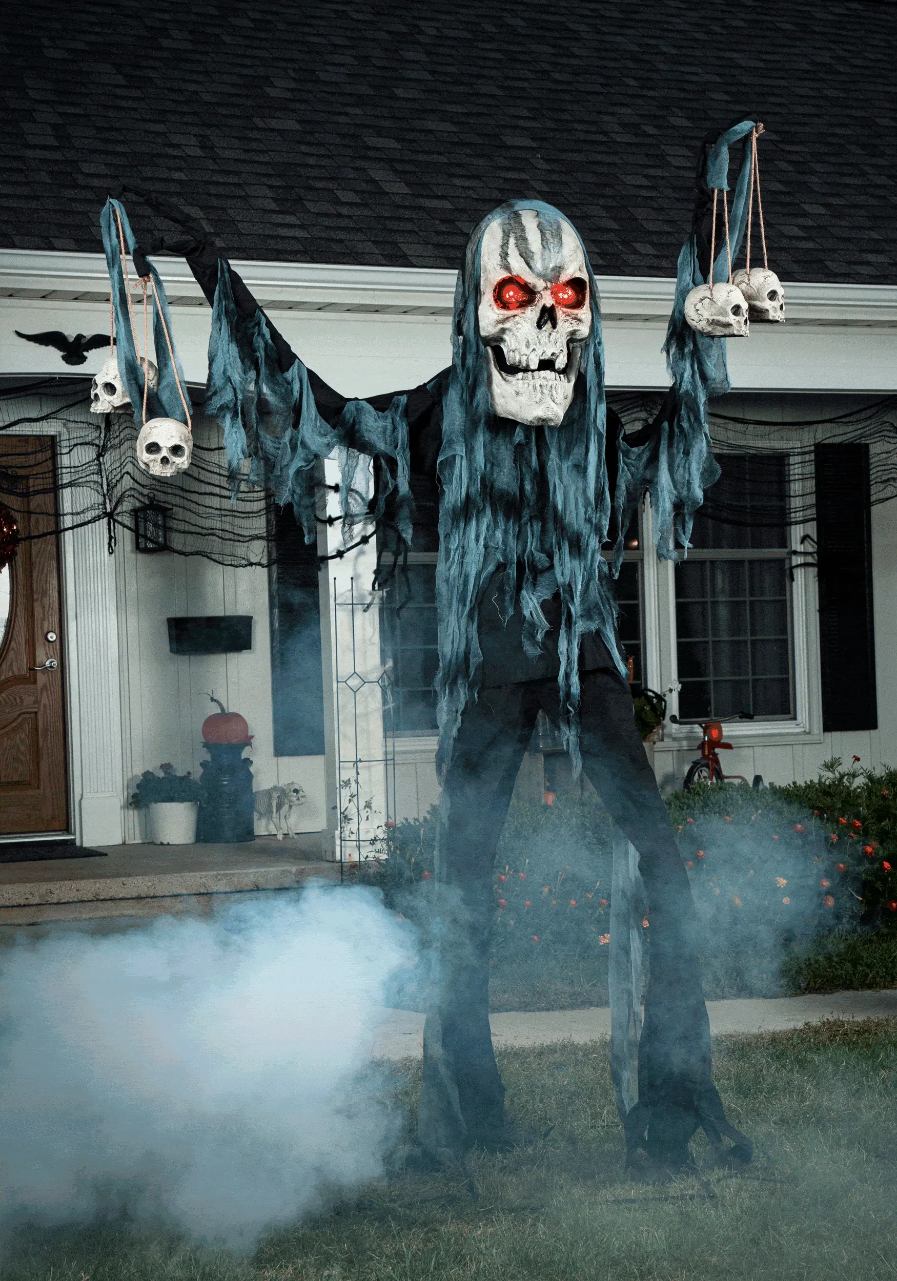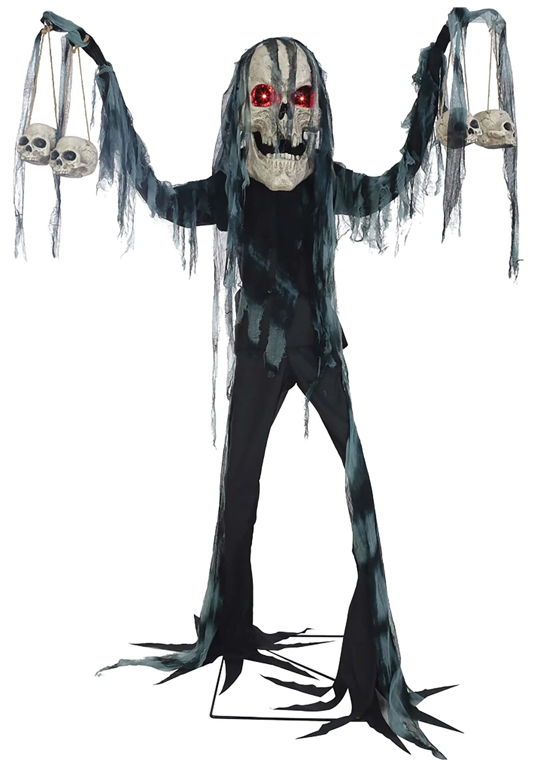 - Animated prop features a giant oversized head skull w/ hinged jaw and red eyes