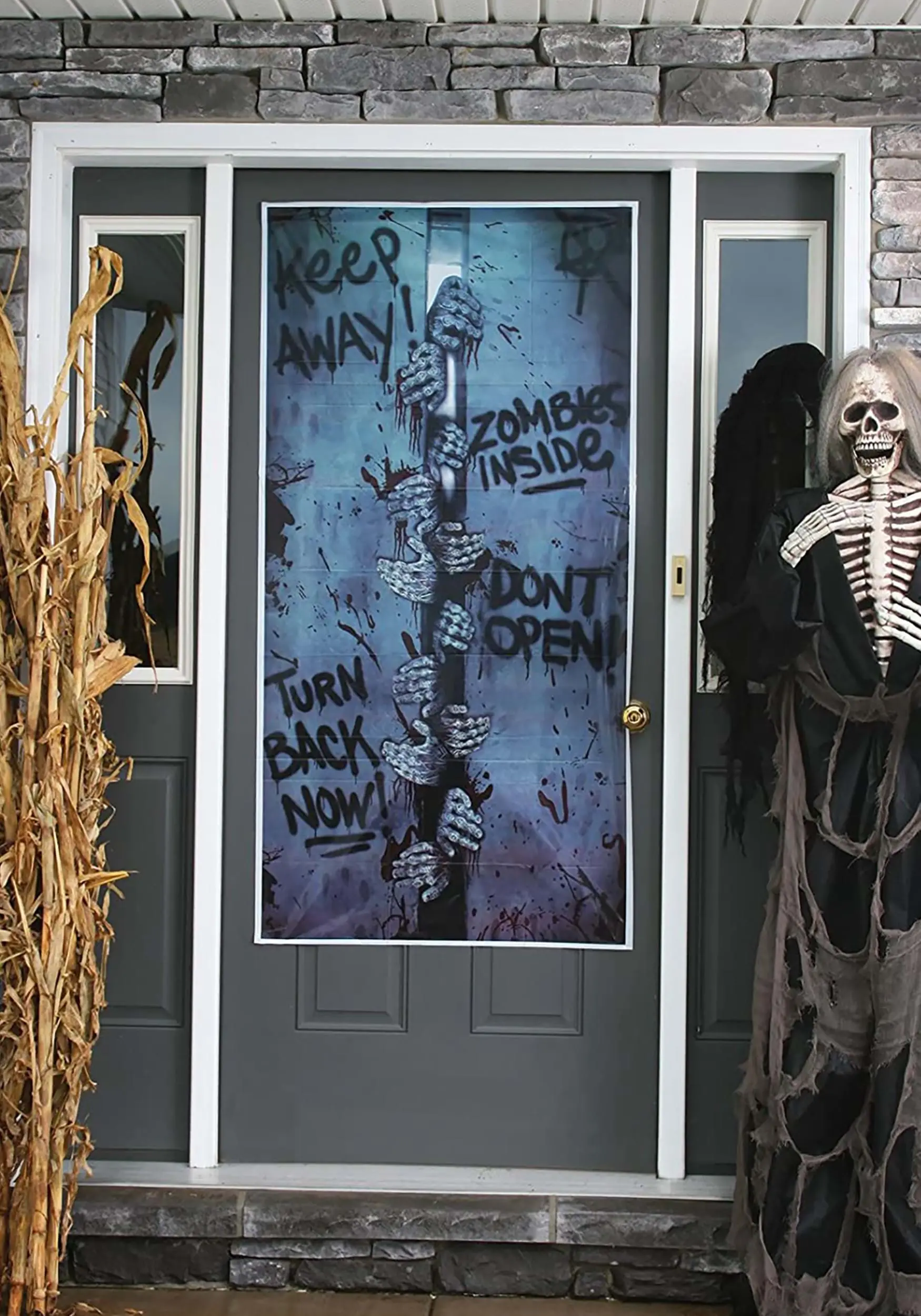 This Zombies Inside Door Cover features our new communication key in vivid style! Just place it on your door to let everyone know that some gruesome zombies are awaiting your guests… or just place it on your door to get some peace and quiet from the rest of the world! Everyone will think that the ghouls have already made it inside. It truly is a versatile decoration!